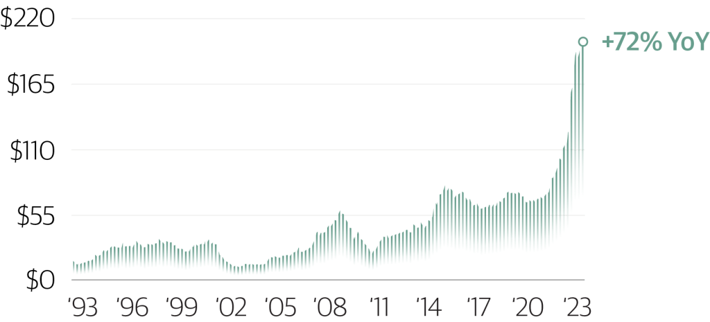 - Across the US, there have been significant upward revisions to regional power demand forecasts compared to 3-5 years ago (the latest forecast roughly 11x greater or an 8% CAGR).1